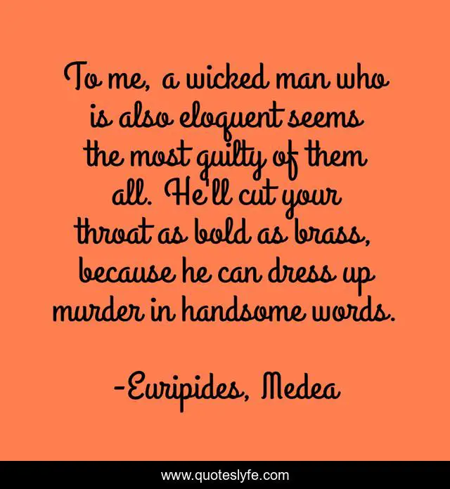 This page presents the quote "To me, a wicked man who is also eloquent seems the most guilty of them all. He'll cut your throat as bold as brass, because he can dress up murder in handsome words.". Author of this quote is Euripides, Medea. This quote is about girl-power, morality, guilt, medea, wicked,.