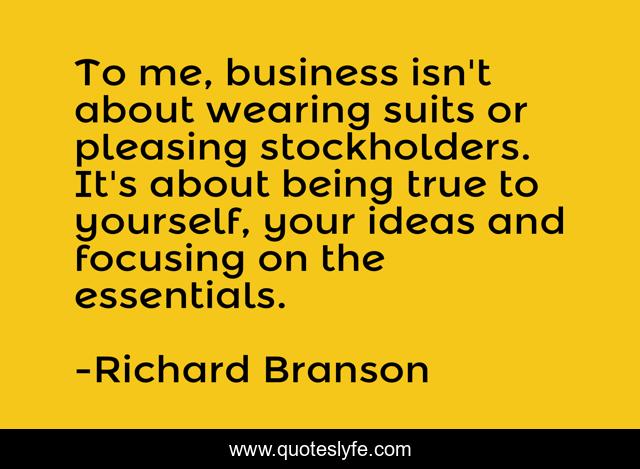 This page presents the quote "To me, business isn't about wearing suits or pleasing stockholders. It's about being true to yourself, your ideas and focusing on the essentials.". Author of this quote is Richard Branson. This quote is about me, ideas, yourself,.