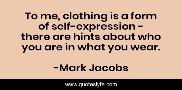 This page presents the quote "To me, clothing is a form of self-expression - there are hints about who you are in what you wear.". Author of this quote is Mark Jacobs. This quote is about fashion, expression,.