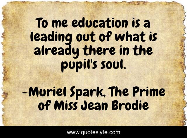 This page presents the quote "To me education is a leading out of what is already there in the pupil's soul.". Author of this quote is Muriel Spark, The Prime of Miss Jean Brodie. This quote is about education, soul,.