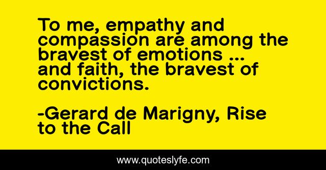 This page presents the quote "To me, empathy and compassion are among the bravest of emotions ... and faith, the bravest of convictions.". Author of this quote is Gerard de Marigny, Rise to the Call. This quote is about faith, empathy, inspirational-religious, compassion, courage, inspirational, enthusiasm, heroes,.
