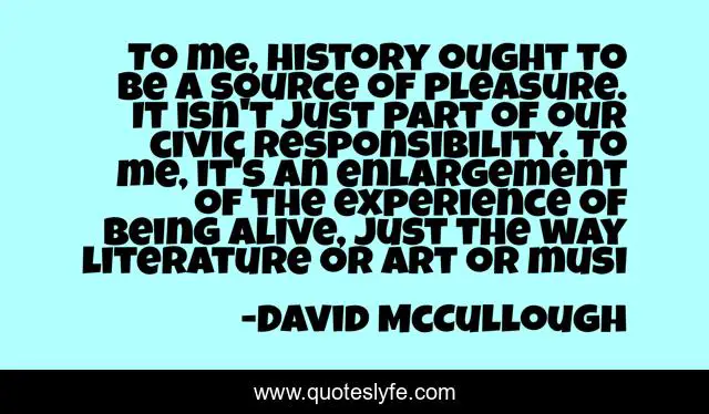 This page presents the quote "To me, history ought to be a source of pleasure. It isn't just part of our civic responsibility. To me, it's an enlargement of the experience of being alive, just the way literature or art or musi". Author of this quote is David McCullough. This quote is about life, civic-duty, civic-responsibility, responsibility, mankind, humanity, history,.