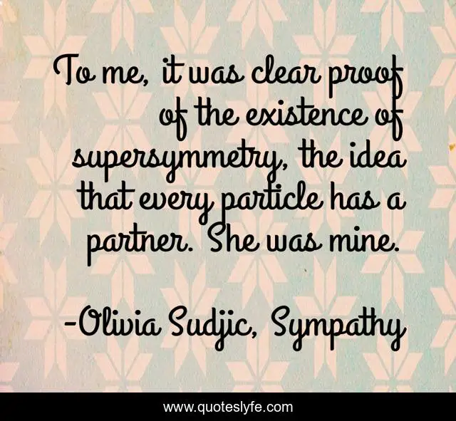 This page presents the quote "To me, it was clear proof of the existence of supersymmetry, the idea that every particle has a partner. She was mine.". Author of this quote is Olivia Sudjic, Sympathy. This quote is about olivia-sudjic, soulmates, supersymmetry, sympathy,.