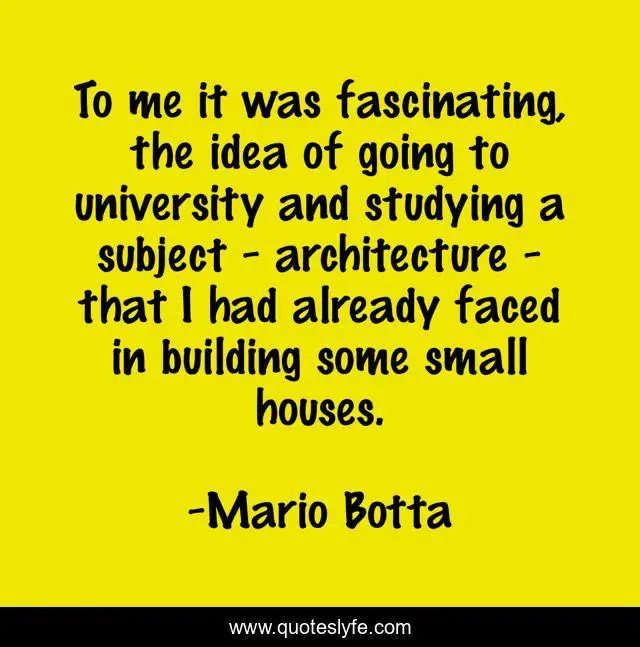 This page presents the quote "To me it was fascinating, the idea of going to university and studying a subject - architecture - that I had already faced in building some small houses.". Author of this quote is Mario Botta. This quote is about small, me, building,.