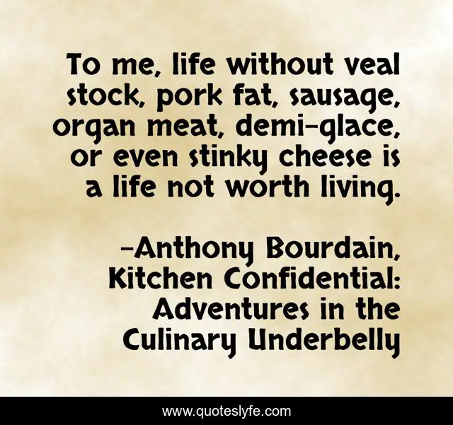 "Anthony Bourdain, Kitchen Confidential: Adventures in the Culinary Underbelly Quotes." Quoteslyfe.com, 2025. Mon. 08 Dec. 2025. <https://www.quoteslyfe.com/quote/To-me-life-without-veal-stock-pork-167897>.
