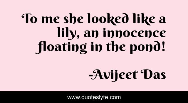 This page presents the quote "To me she looked like a lily, an innocence floating in the pond!". Author of this quote is Avijeet Das. This quote is about flower, life-and-sayings, innocence, pond, girl, meaning-of-life, lily,.