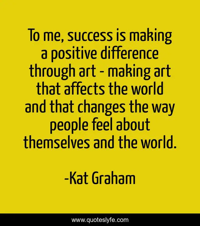This page presents the quote "To me, success is making a positive difference through art - making art that affects the world and that changes the way people feel about themselves and the world.". Author of this quote is Kat Graham. This quote is about art, changes, success,.