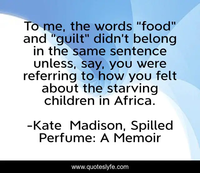 This page presents the quote "To me, the words “food” and “guilt” didn’t belong in the same sentence unless, say, you were referring to how you felt about the starving children in Africa.". Author of this quote is Kate Madison, Spilled Perfume: A Memoir. This quote is about food-guilt, memoir, diet,.