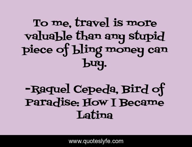 This page presents the quote "To me, travel is more valuable than any stupid piece of bling money can buy.". Author of this quote is Raquel Cepeda, Bird of Paradise: How I Became Latina. This quote is about bling, travel, value-in-traveling, journey, traveling-abroad, journeying,.
