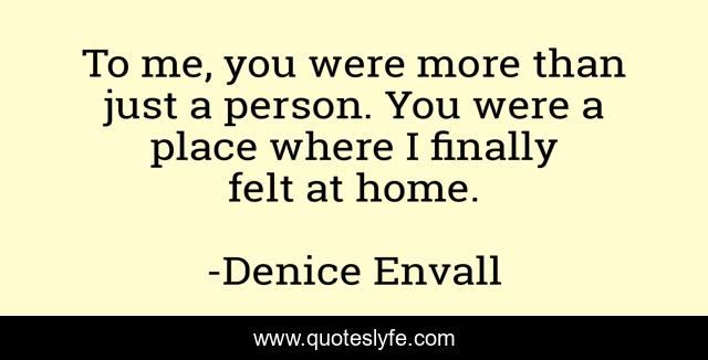 This page presents the quote "To me, you were more than just a person. You were a place where I finally felt at home.". Author of this quote is Denice Envall. This quote is about loss, lonely, love, loneliness, feelings, sadness, unrequited-love, home, emptiness,.