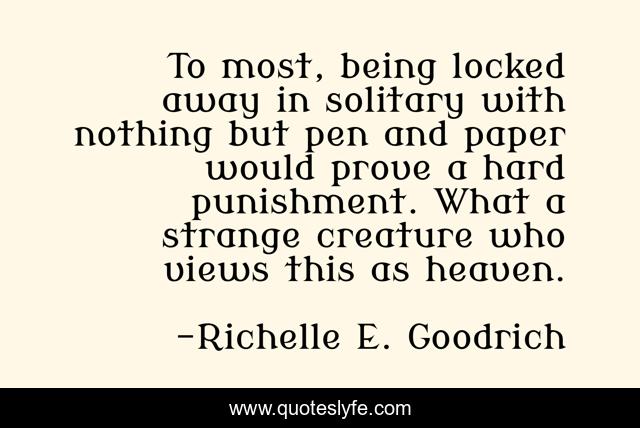 This page presents the quote "To most, being locked away in solitary with nothing but pen and paper would prove a hard punishment. What a strange creature who views this as heaven.". Author of this quote is Richelle E. Goodrich. This quote is about richelle-goodrich, authors, writers, richelle, writing,.