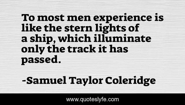 This page presents the quote "To most men experience is like the stern lights of a ship, which illuminate only the track it has passed.". Author of this quote is Samuel Taylor Coleridge. This quote is about ship, men, like,.