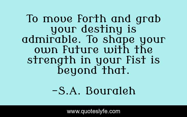 This page presents the quote "To move forth and grab your destiny is admirable. To shape your own future with the strength in your fist is beyond that.". Author of this quote is S.A. Bouraleh. This quote is about inner-strength, future, strength, destiny,.