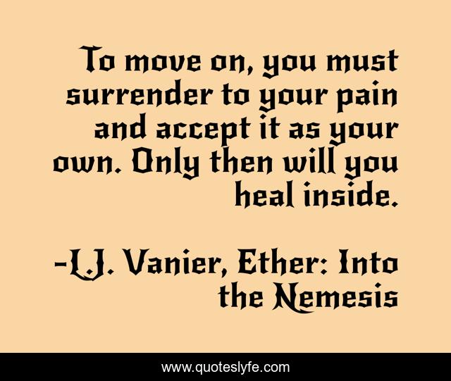 This page presents the quote "To move on, you must surrender to your pain and accept it as your own. Only then will you heal inside.". Author of this quote is L.J. Vanier, Ether: Into the Nemesis. This quote is about moving-on, moving-on-and-letting-go,.
