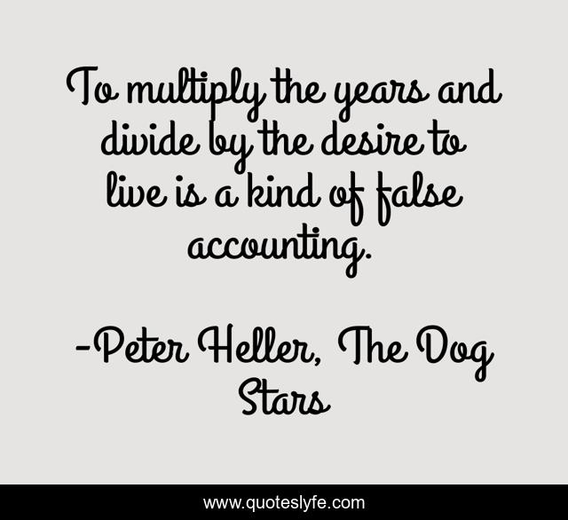 This page presents the quote "To multiply the years and divide by the desire to live is a kind of false accounting.". Author of this quote is Peter Heller, The Dog Stars. This quote is about grief, loneliness, grieving, sadness, depression,.