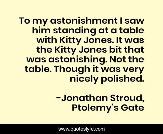 This page presents the quote "To my astonishment I saw him standing at a table with Kitty Jones. It was the Kitty Jones bit that was astonishing. Not the table. Though it was very nicely polished.". Author of this quote is Jonathan Stroud, Ptolemy's Gate. This quote is about sarcasm, humor, bartimaeus,.