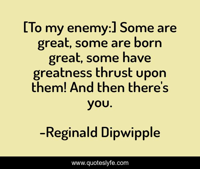 This page presents the quote "[To my enemy:] Some are great, some are born great, some have greatness thrust upon them! And then there's you.". Author of this quote is Reginald Dipwipple. .
