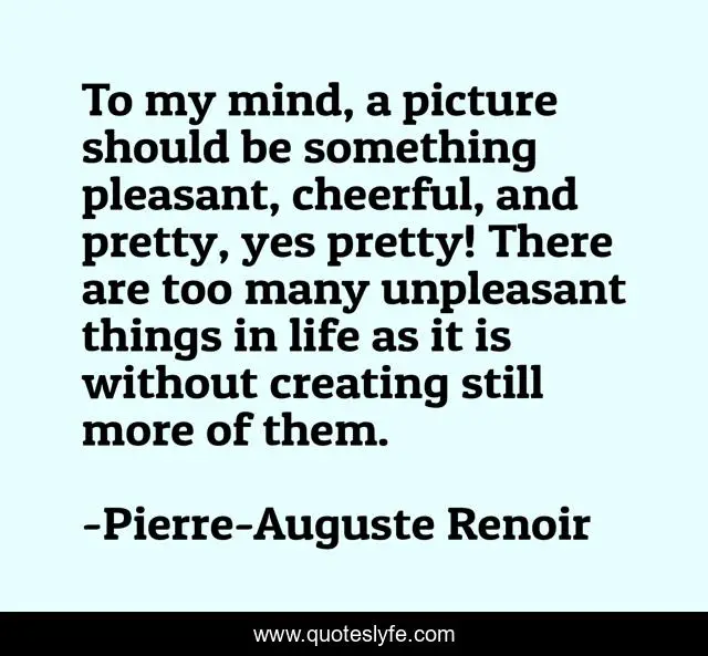 This page presents the quote "To my mind, a picture should be something pleasant, cheerful, and pretty, yes pretty! There are too many unpleasant things in life as it is without creating still more of them.". Author of this quote is Pierre-Auguste Renoir. This quote is about impressionism, art, paris, france, inspirational, impressionist, enthusiasm,.
