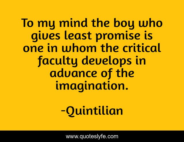 This page presents the quote "To my mind the boy who gives least promise is one in whom the critical faculty develops in advance of the imagination.". Author of this quote is Quintilian. This quote is about boy, mind, promise,.