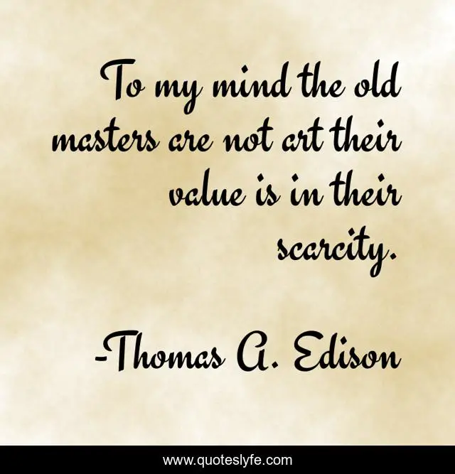 This page presents the quote "To my mind the old masters are not art their value is in their scarcity.". Author of this quote is Thomas A. Edison. This quote is about mind, old, value,.