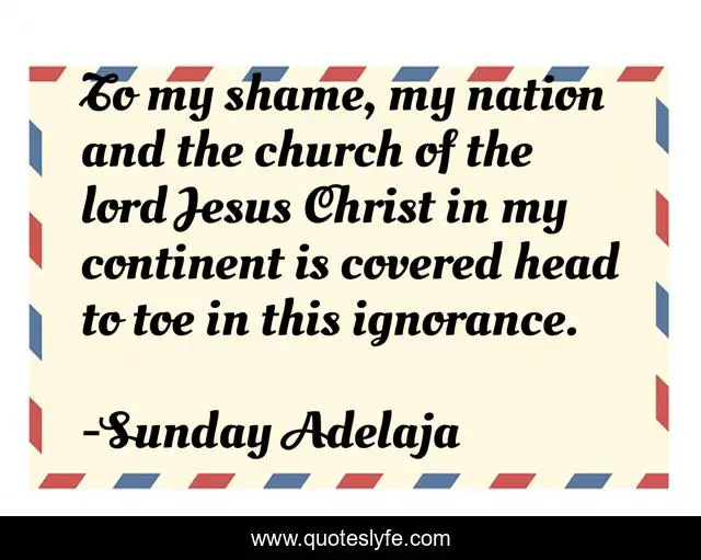 This page presents the quote "To my shame, my nation and the church of the lord Jesus Christ in my continent is covered head to toe in this ignorance.". Author of this quote is Sunday Adelaja. This quote is about head, christ, jesus, shame, church, covered, lord, nation, my,.