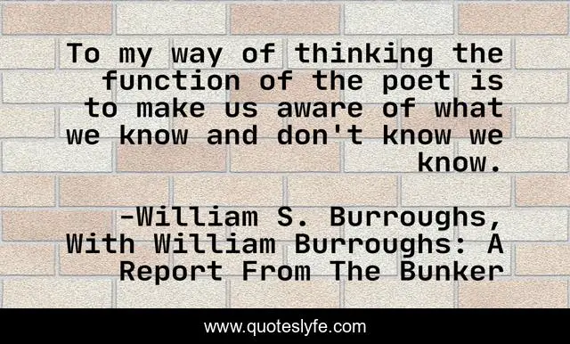 This page presents the quote "To my way of thinking the function of the poet is to make us aware of what we know and don't know we know.". Author of this quote is William S. Burroughs, With William Burroughs: A Report From The Bunker. This quote is about poet, function-of-the-poet,.