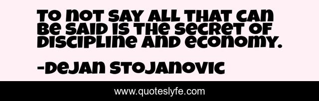 This page presents the quote "To not say all that can be said is the secret of discipline and economy.". Author of this quote is Dejan Stojanovic. This quote is about discipline, literature, dejan-stojanovic, poetry, wisdom, quotes, secret, quotes-to-live-by, thoughts,.