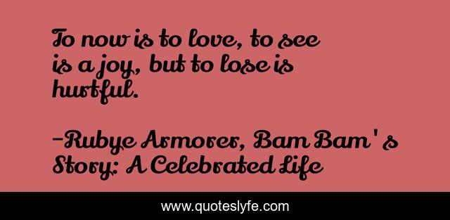 This page presents the quote "To now is to love, to see is a joy, but to lose is hurtful.". Author of this quote is Rubye Armorer, Bam Bam's Story: A Celebrated Life. This quote is about biographical, inspiratinal, teenagers, children-s-book,.