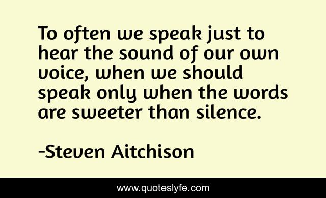 This page presents the quote "To often we speak just to hear the sound of our own voice, when we should speak only when the words are sweeter than silence.". Author of this quote is Steven Aitchison. This quote is about confidence, inspirational, positive, motivational, optimistic, words, enthusiasm, silence,.