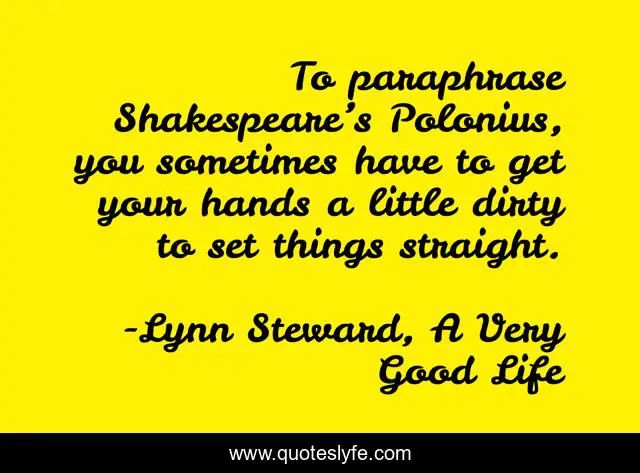 This page presents the quote "To paraphrase Shakespeare’s Polonius, you sometimes have to get your hands a little dirty to set things straight.". Author of this quote is Lynn Steward, A Very Good Life. This quote is about a-very-good-life, new-york-city, lynn-steward,.