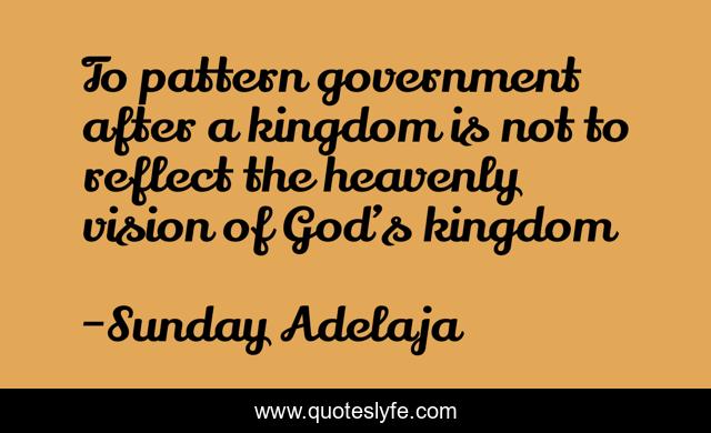 This page presents the quote "To pattern government after a kingdom is not to reflect the heavenly vision of God’s kingdom". Author of this quote is Sunday Adelaja. This quote is about kingdom, god, government, reflect, pattern,.