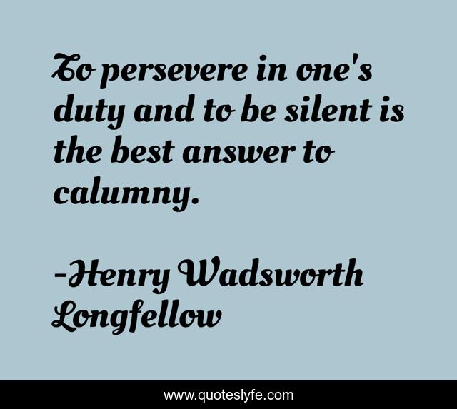 This page presents the quote "To persevere in one's duty and to be silent is the best answer to calumny.". Author of this quote is Henry Wadsworth Longfellow. .