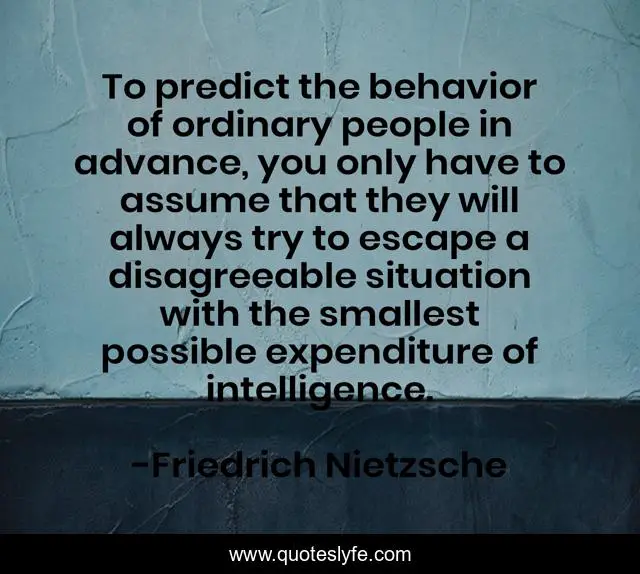 This page presents the quote "To predict the behavior of ordinary people in advance, you only have to assume that they will always try to escape a disagreeable situation with the smallest possible expenditure of intelligence.". Author of this quote is Friedrich Nietzsche. .