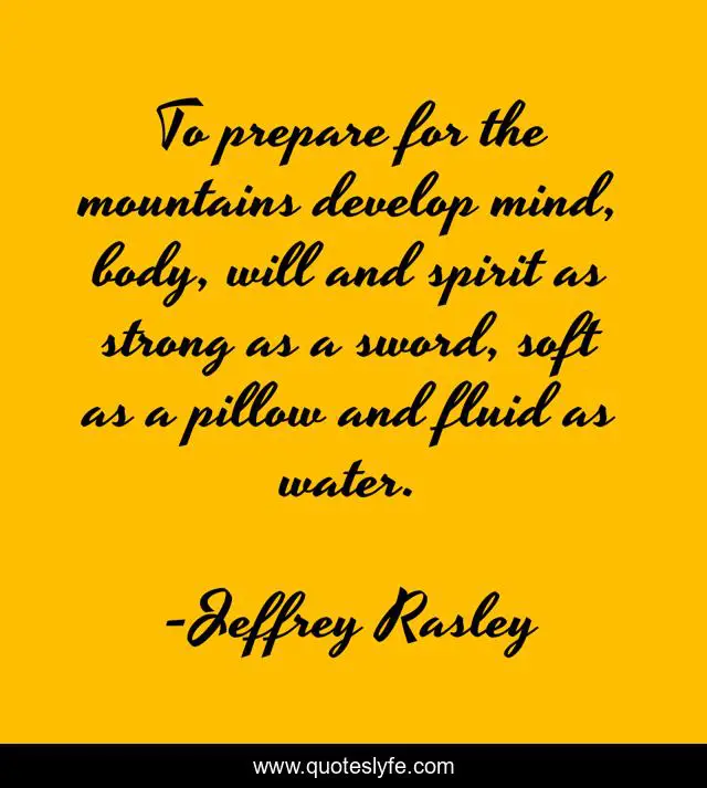 This page presents the quote "To prepare for the mountains develop mind, body, will and spirit as strong as a sword, soft as a pillow and fluid as water.". Author of this quote is Jeffrey Rasley. This quote is about enthusiasm, inspirational,.