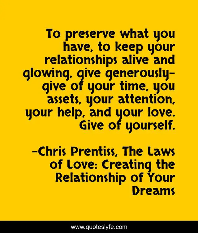 This page presents the quote "To preserve what you have, to keep your relationships alive and glowing, give generously- give of your time, you assets, your attention, your help, and your love. Give of yourself.". Author of this quote is Chris Prentiss, The Laws of Love: Creating the Relationship of Your Dreams. This quote is about relationships, dating-advice, laws-of-love, self-improvement,.