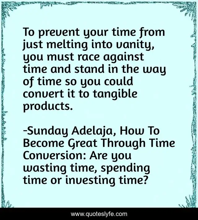 This page presents the quote "To prevent your time from just melting into vanity, you must race against time and stand in the way of time so you could convert it to tangible products.". Author of this quote is Sunday Adelaja, How To Become Great Through Time Conversion: Are you wasting time, spending time or investing time?. This quote is about life, conversion, productivity, wealth, greatness, waste, humanity, product, race-against-time,.
