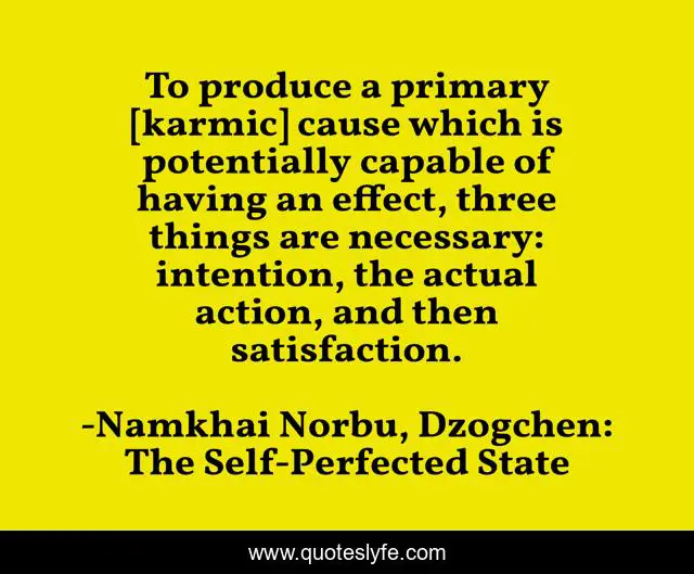 This page presents the quote "To produce a primary [karmic] cause which is potentially capable of having an effect, three things are necessary: intention, the actual action, and then satisfaction.". Author of this quote is Namkhai Norbu, Dzogchen: The Self-Perfected State. This quote is about buddhism, karma, 1989,.