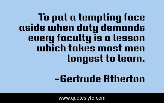 This page presents the quote "To put a tempting face aside when duty demands every faculty is a lesson which takes most men longest to learn.". Author of this quote is Gertrude Atherton. This quote is about control, self,.
