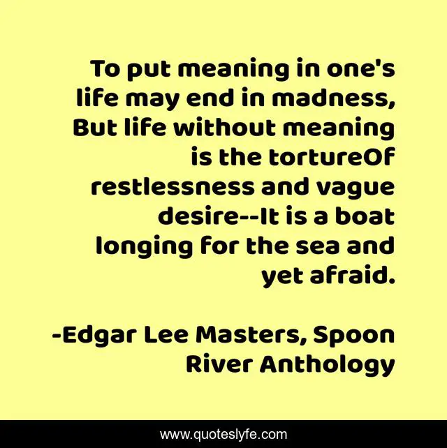 This page presents the quote "To put meaning in one's life may end in madness, But life without meaning is the tortureOf restlessness and vague desire--It is a boat longing for the sea and yet afraid.". Author of this quote is Edgar Lee Masters, Spoon River Anthology. This quote is about enthusiasm, life, meaning, inspirational,.