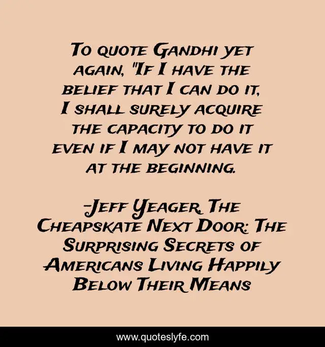 This page presents the quote "To quote Gandhi yet again, "If I have the belief that I can do it, I shall surely acquire the capacity to do it even if I may not have it at the beginning.". Author of this quote is Jeff Yeager, The Cheapskate Next Door: The Surprising Secrets of Americans Living Happily Below Their Means. This quote is about confidence, belief,.