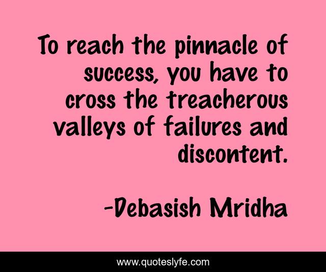 This page presents the quote "To reach the pinnacle of success, you have to cross the treacherous valleys of failures and discontent.". Author of this quote is Debasish Mridha. This quote is about discontent, how-to-be-a-success, success, failure, philosophy, debasish-mridha, quotes, inspirational, enthusiasm,.