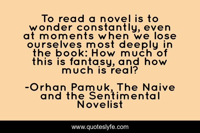 This page presents the quote "To read a novel is to wonder constantly, even at moments when we lose ourselves most deeply in the book: How much of this is fantasy, and how much is real?". Author of this quote is Orhan Pamuk, The Naive and the Sentimental Novelist. This quote is about fantasy, novel, reading, reality,.