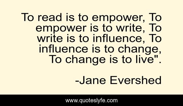 This page presents the quote "To read is to empower, To empower is to write, To write is to influence, To influence is to change, To change is to live".". Author of this quote is Jane Evershed. This quote is about enthusiasm, books, inspirational,.