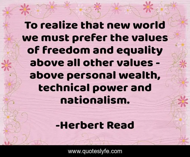 This page presents the quote "To realize that new world we must prefer the values of freedom and equality above all other values - above personal wealth, technical power and nationalism.". Author of this quote is Herbert Read. This quote is about freedom, power, world,.