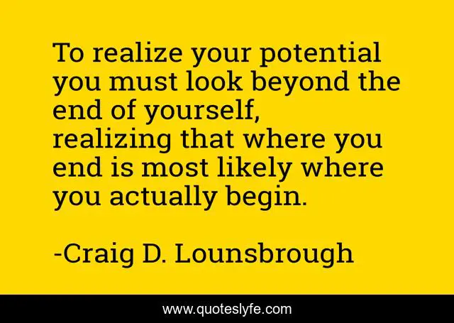 This page presents the quote "To realize your potential you must look beyond the end of yourself, realizing that where you end is most likely where you actually begin.". Author of this quote is Craig D. Lounsbrough. This quote is about development, spiritual-growth, begin, abilities, end, ability, personal-growth, beginning, self,.