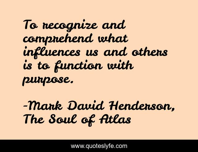 This page presents the quote "To recognize and comprehend what influences us and others is to function with purpose.". Author of this quote is Mark David Henderson, The Soul of Atlas. This quote is about relationships, politics, philosophy, sociology, world-views,.