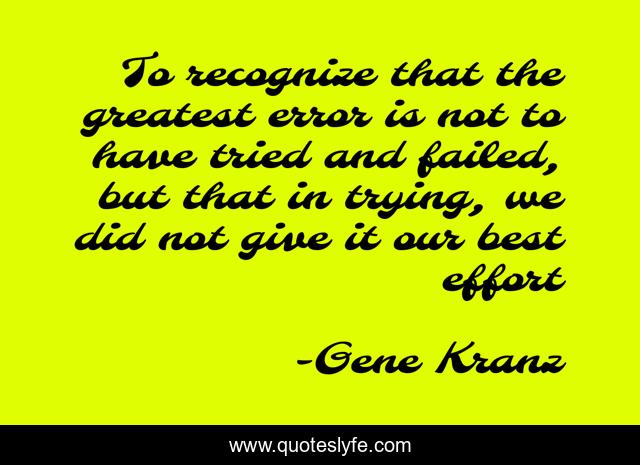 This page presents the quote "To recognize that the greatest error is not to have tried and failed, but that in trying, we did not give it our best effort". Author of this quote is Gene Kranz. This quote is about behaviour, attitude, inspiration,.