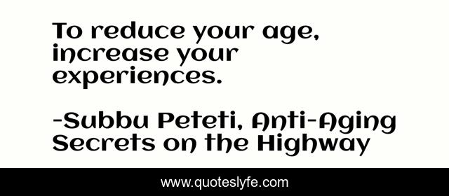 "Subbu Peteti, Anti-Aging Secrets on the Highway Quotes." Quoteslyfe.com, 2025. Sat. 06 Dec. 2025. <https://www.quoteslyfe.com/quote/To-reduce-your-age-increase-your-experiences-77916>.