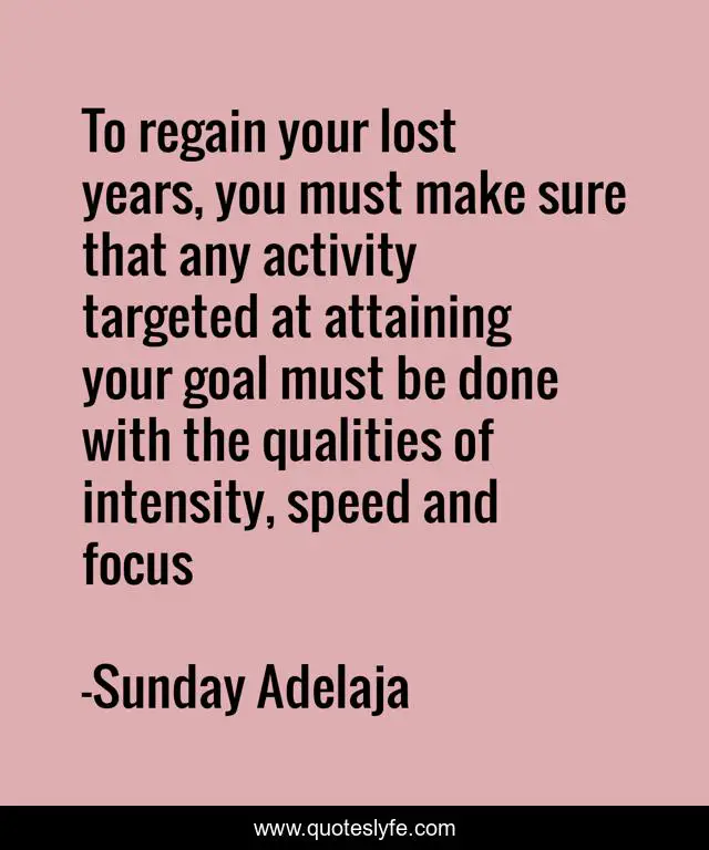 This page presents the quote "To regain your lost years, you must make sure that any activity targeted at attaining your goal must be done with the qualities of intensity, speed and focus". Author of this quote is Sunday Adelaja. This quote is about love, pragmatic, consciousness, people, money, principles, selflessness, intensity, employment,.