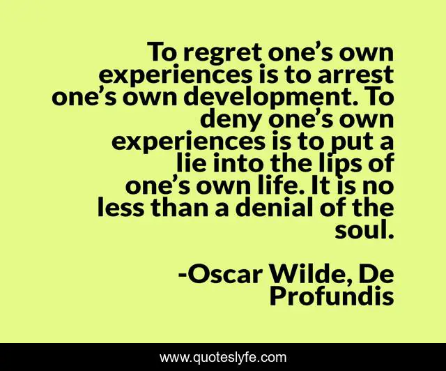 This page presents the quote "To regret one’s own experiences is to arrest one’s own development. To deny one’s own experiences is to put a lie into the lips of one’s own life. It is no less than a denial of the soul.". Author of this quote is Oscar Wilde, De Profundis. This quote is about life, denial, spiritual-development, truth, soul,.